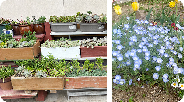 お父さまが育てている多肉植物の鉢と、庭に咲きほこるネモフィラ