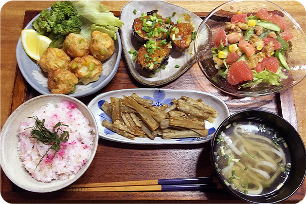 『きょうの料理』のレシピを参考に、お孫さんと一緒に作った夏野菜がメインの献立