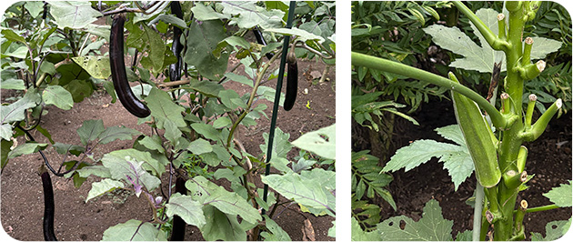 畑で収穫した野菜は、毎日料理に使っています。今朝もオクラとナスをいただきました。